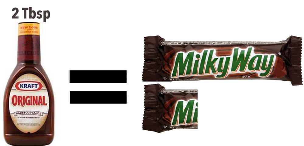 #14 | Barbecue Sauce. Would you believe that only 2 Tbsp of some popular BBQ Sauce brands have 13g of Sugar? That’s about 1 and 1/4 of a Fun Size Milky Way. Sugar in BBQ sauce can add up fast because most people use more than 2 Tbsp on their food. There are some BBQ sauce brands out there without added sugar (or with very little added sugar) – so look for those or make your own at home!