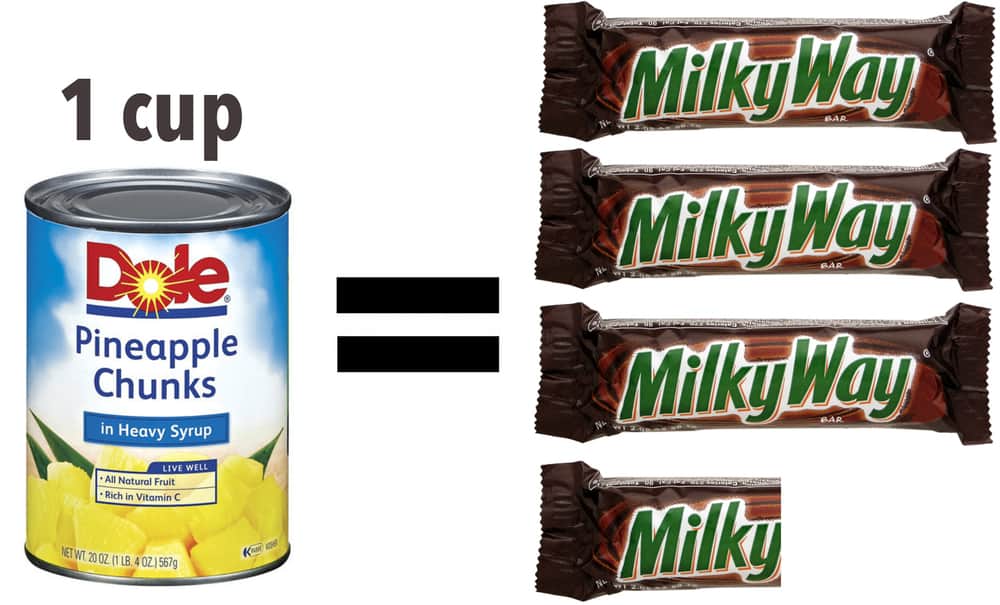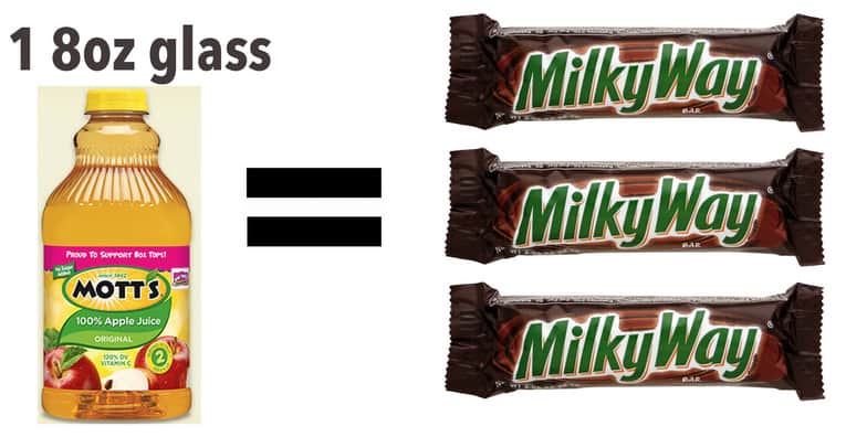So I said: “Ok. Drinking that glass of juice is like eating a regular sized Snickers Bar. Or Milky Way Bar. Or just about any candy bar.”