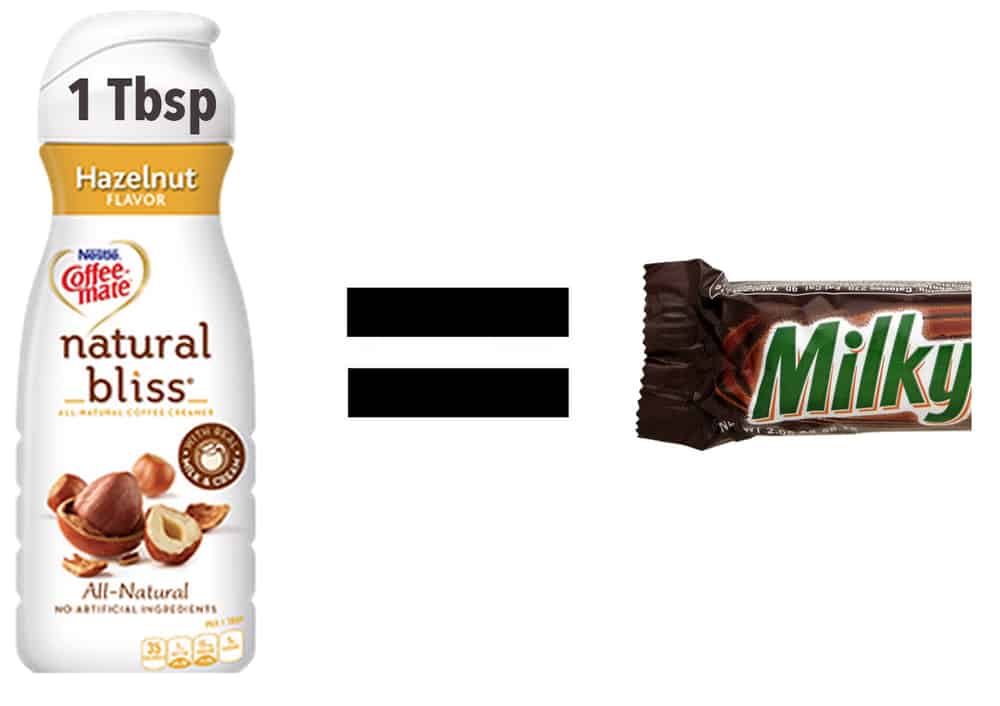 #20 | Coffee Creamer. Didn’t you think coffee creamer was cream? It’s actually water mixed with syrup with cream as one of the farther-down-the-list ingredients. 1 Tbsp has 5g sugar – 1/2 of a Fun Sized Milky Way. Instead, just add regular cream to your coffee!