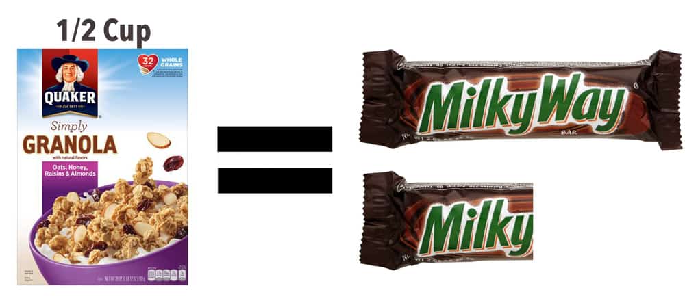 #11 | Granola. Another food product that sounds healthy, but isn’t. 1/2 a cup can have between 10-15g sugar. That’s about 1.5 Fun Sized Milky Ways. Avoid granola and stick to whole grain high fiber / low sugar cereals instead.