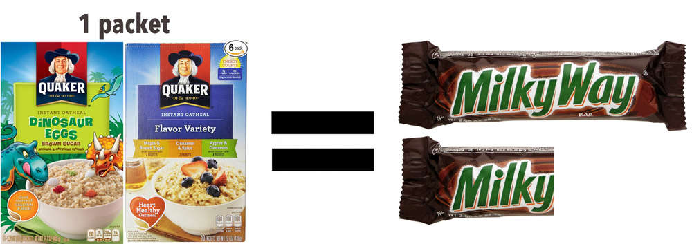 #10 | Instant Flavored Oatmeal. This is one of those food products that seems healthy and is marketed to kids, but has tons of sugar in it. One packet of flavored oatmeal (even the healthy-sounding flavors like “Maple and Brown Sugar”) has between 10-15g sugar per packet. That’s about 1.5 Fun Sized Milky Ways. Instead of the flavored oatmeals, use plain rolled oats and mix in fruit like berries and bananas, nuts/nut butters, and milk to give it flavor.