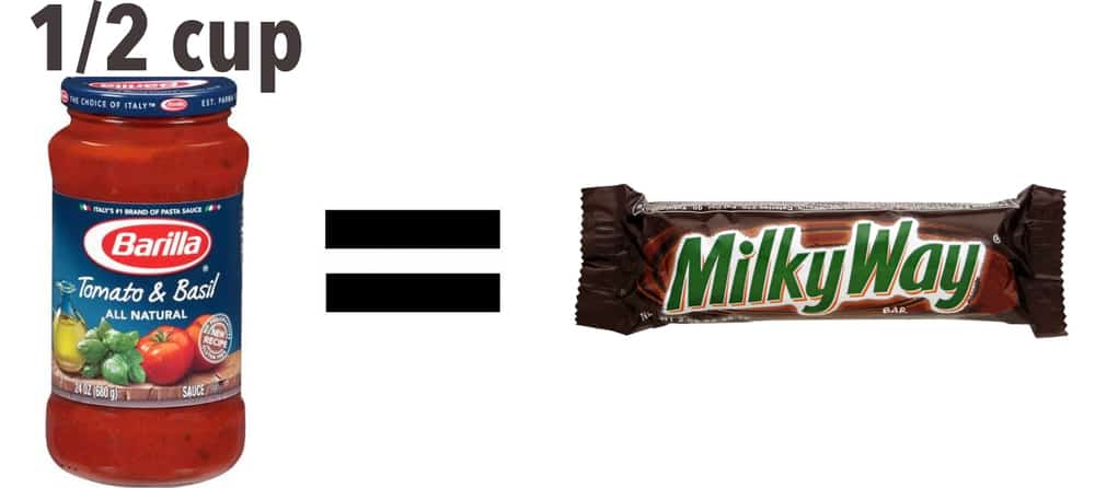 #16 | Pasta Sauce. There are some pasta sauces out there without added sugar, but many brands will have between 6-12g of added sugar for every 1/2 cup serving, which is about 1 Fun Sized Milky Way. The key to avoiding sugar here is label reading – look to see if “sugar” is one of the ingredients listed on the label. If not, then you are good to go!