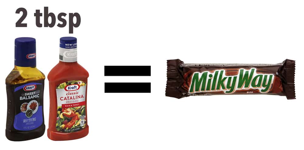 #18 | Salad Dressing. Most pre-made salad dressings like “Raspberry Vineagrette,” “French Dressing,” and “Catalina Dressing” can have up to 10g of sugar for 2 Tbsp. It’s best to make your own salad dressing – it is super easy. I just mix extra virgin olive oil, balsamic vinegar, salt, pepper, and garlic and it tastes great (and has no sugar in it!)